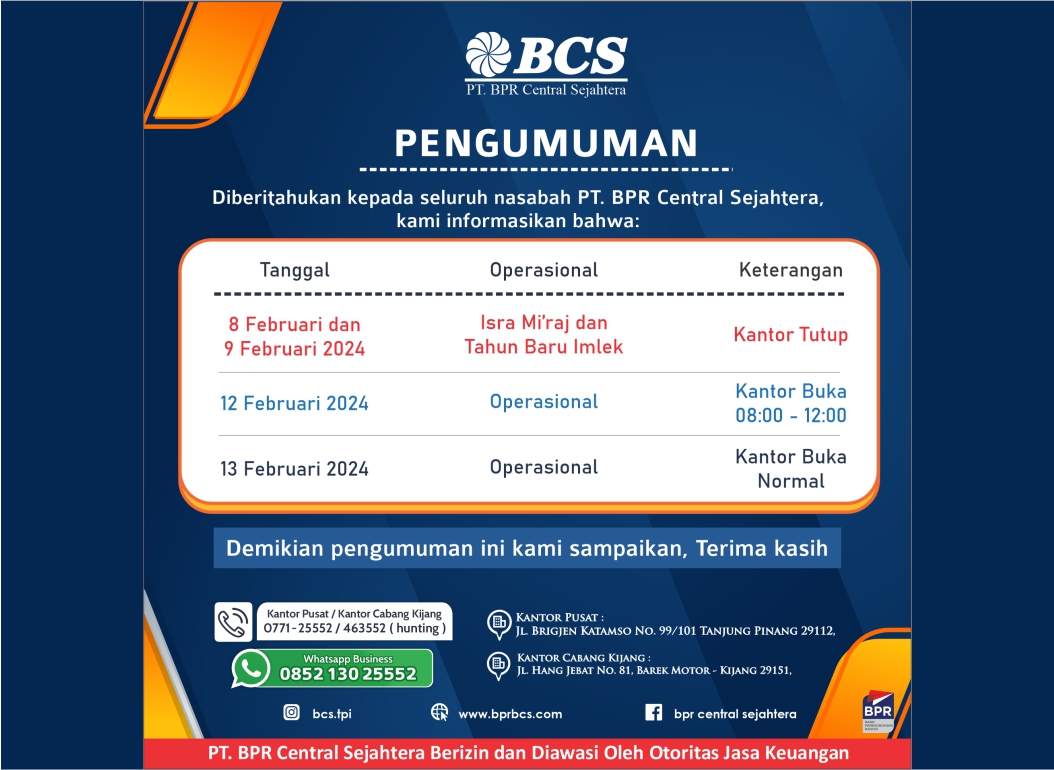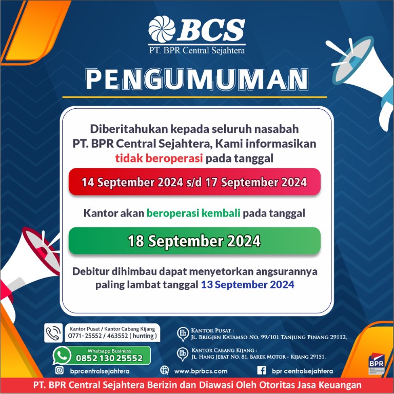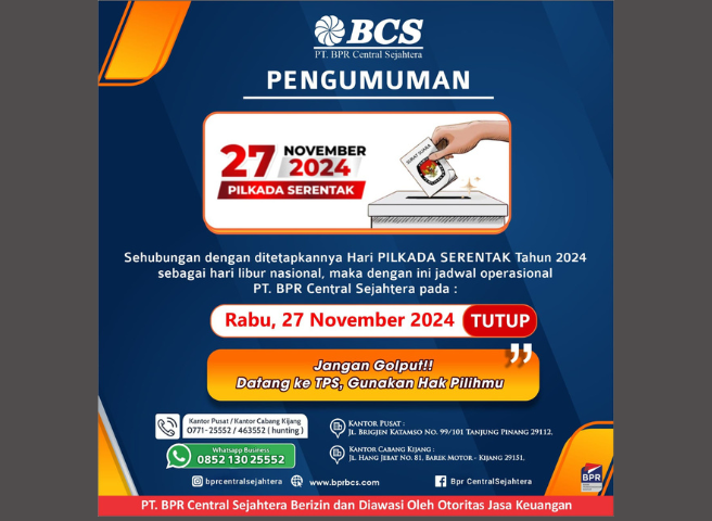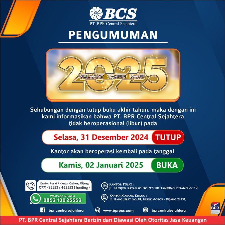 Sehubungan dengan tutup buku akhir tahun, maka dengan ini kami informasikan bahwa PT. BPR CENTRAL SEJAHTERA tidak beropeasional (libur)