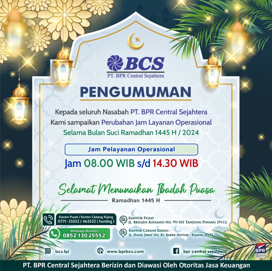 Direksi & Segenap Karyawan/ti PT BPR CENTRAL SEJAHTERA mengucapkan "Selamat Menjalankan Ibadah Puasa"